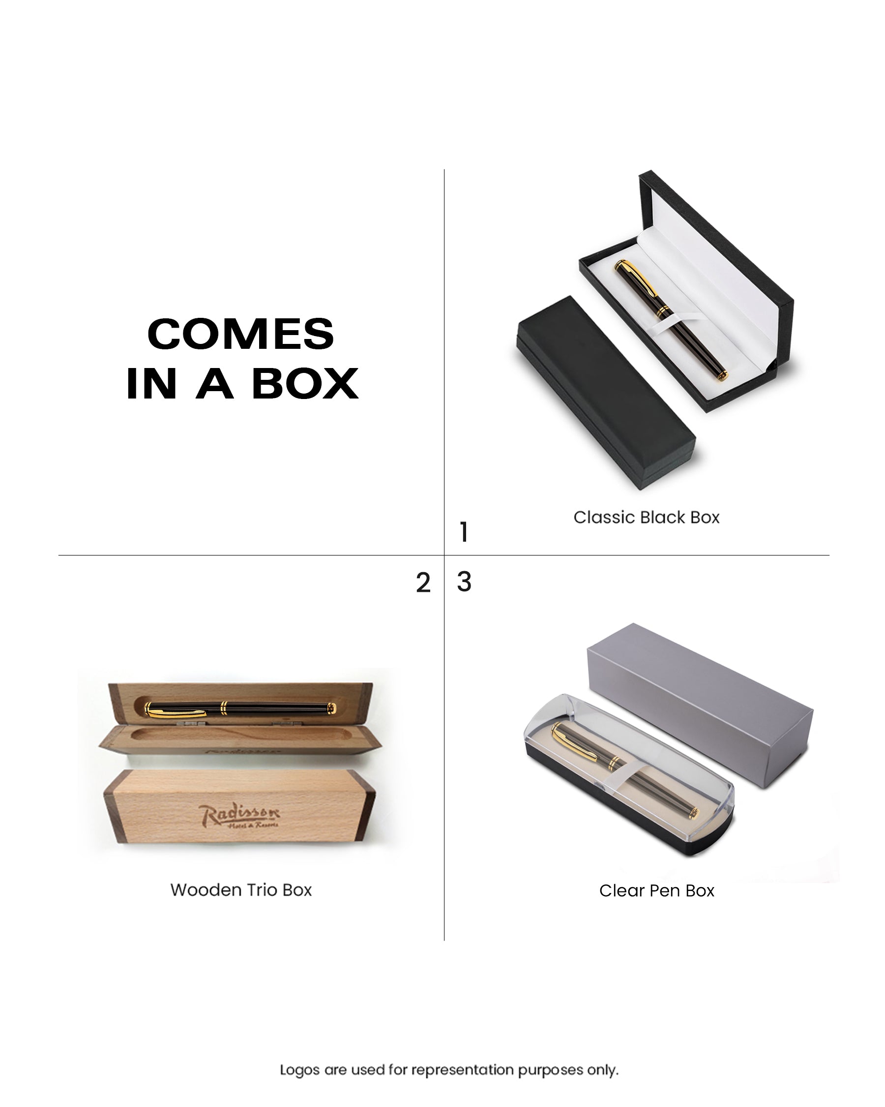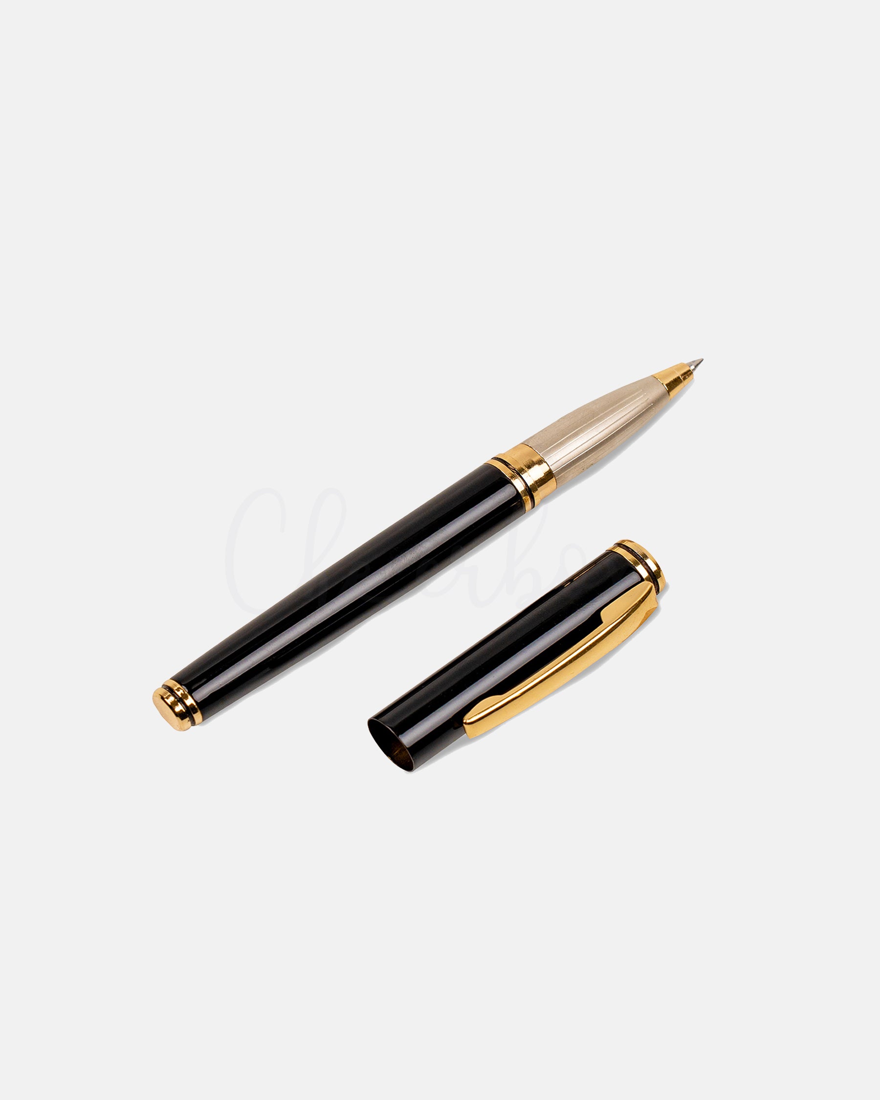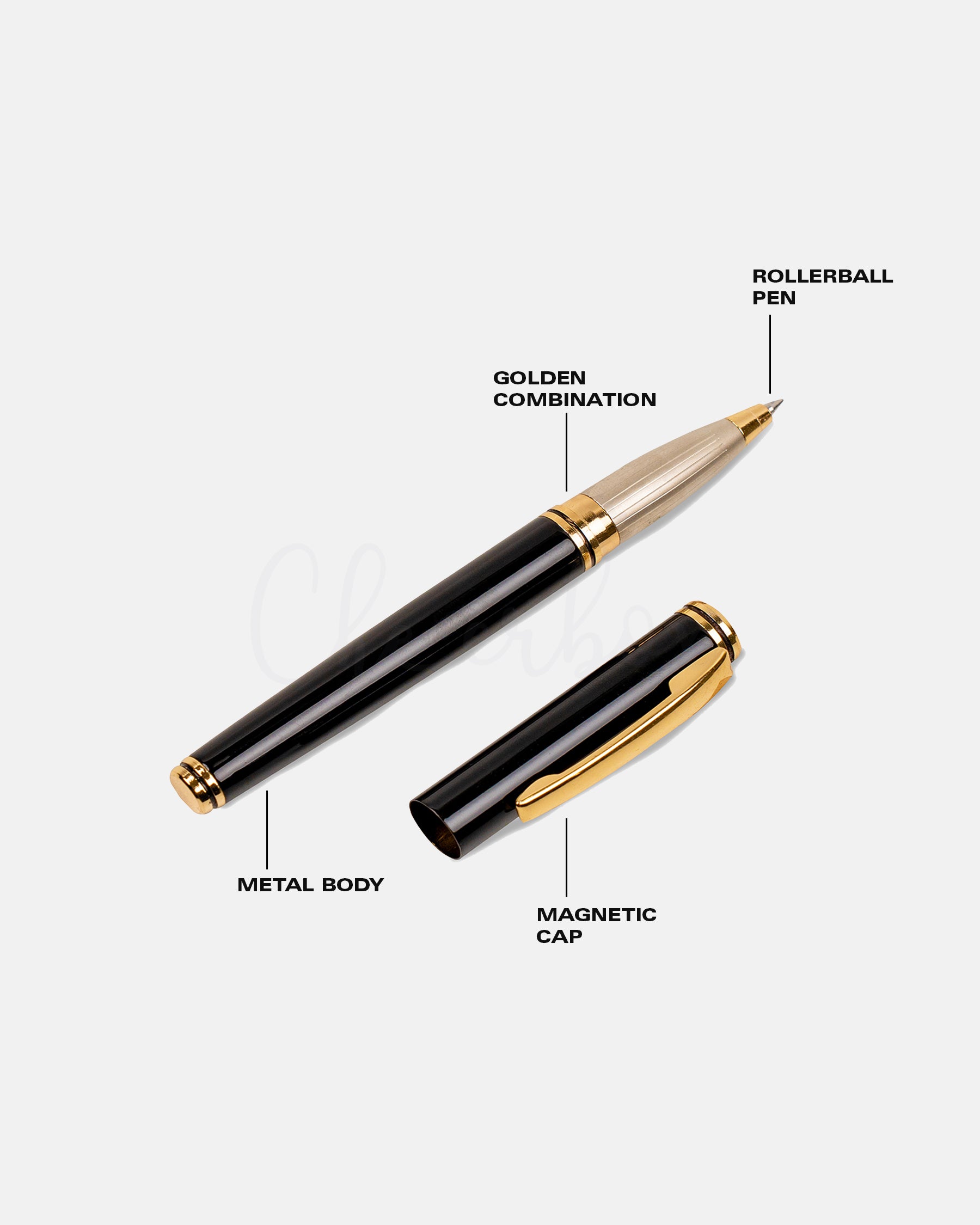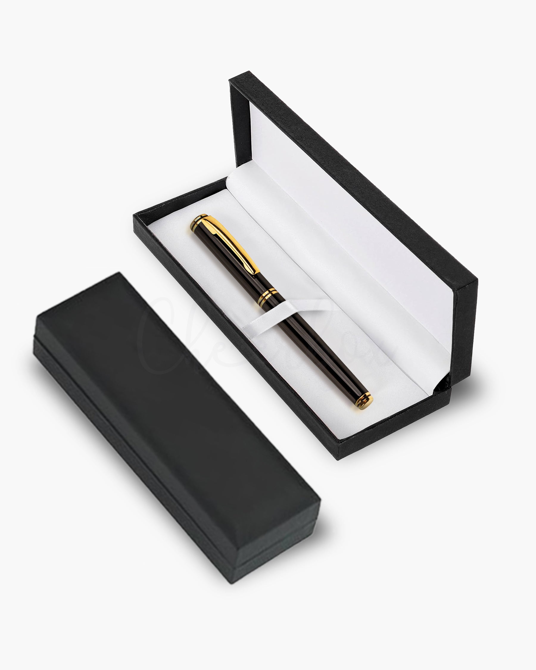 This elegant ballpoint pen features a matte black metal body with polished gold accents, combining timeless executive styling with everyday usability. The precision-engineered tip ensures smooth, consistent ink flow, while the click-off cap with integrated clip offers secure and convenient portability. It is made with a balanced metal build for comfortable handling. The pen is housed in a sleek black gift box with a white satin interior, making it ideal for formal gifting, professional use, or daily writing with a refined touch.