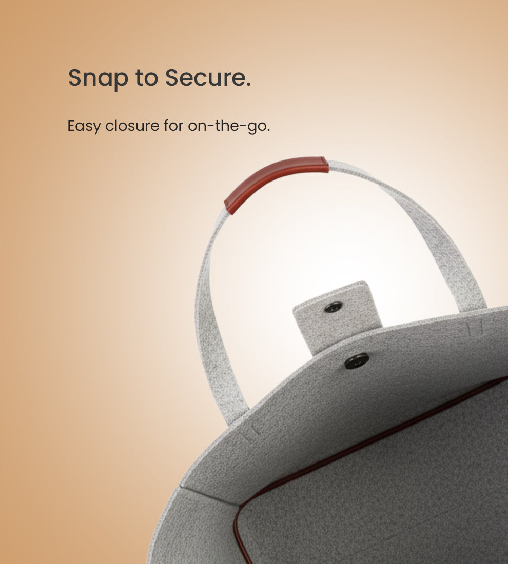 This minimalist grey tote is a polished everyday carry designed for those who appreciate both style and sustainability. Crafted from recycled felt fabric with vegan leather accents, it combines a refined look with practical functionality. The spacious interior comfortably fits daily essentials and more, while the button closure keeps your belongings secure. Lightweight and durable, it transitions effortlessly from office settings to casual outings.
