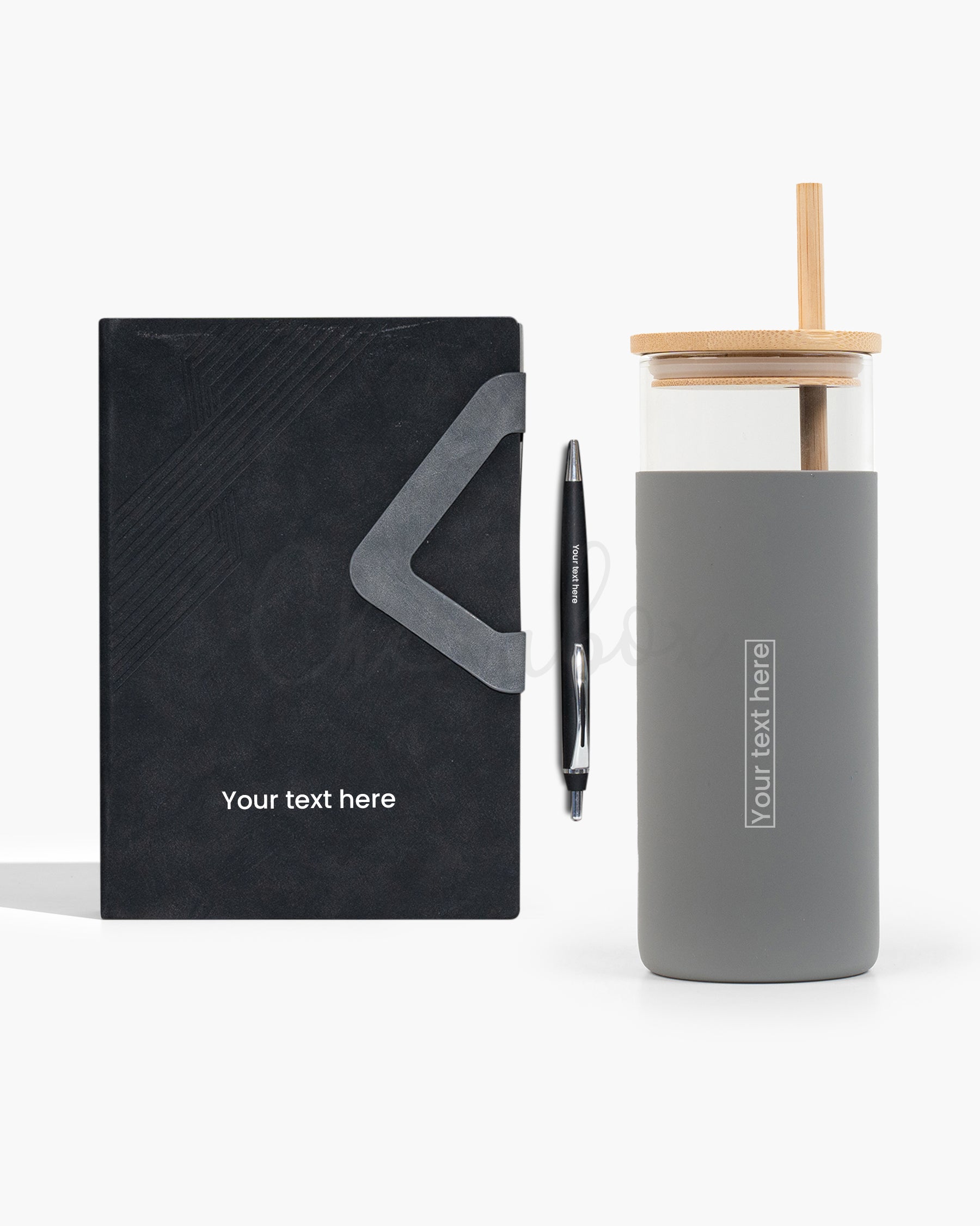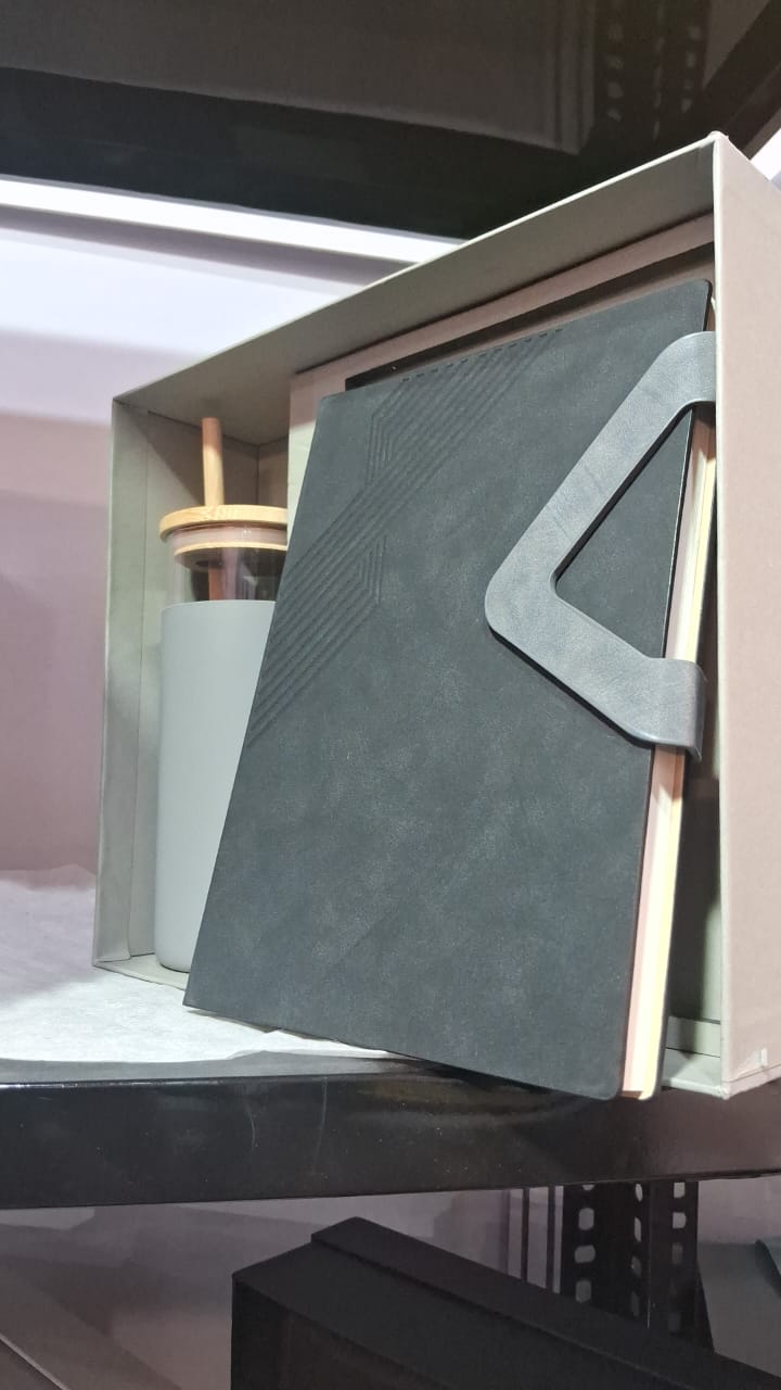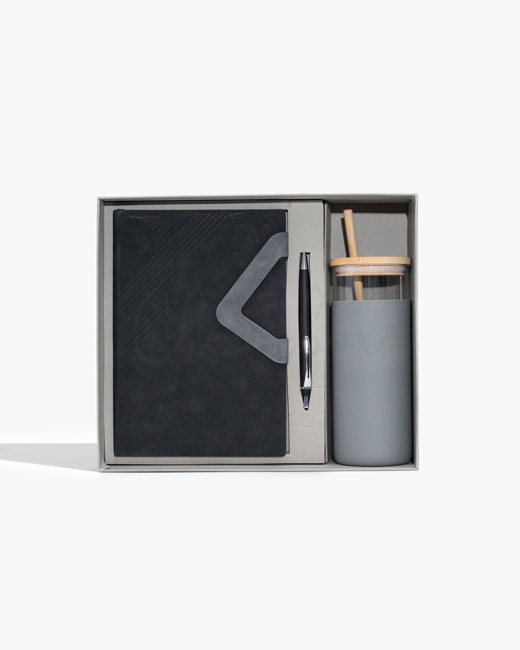 Material Used: Textured hardbound planner, 80 GSM ruled paper, matte-finish metal pen, borosilicate glass tumbler with silicone sleeve, bamboo lid and straw.