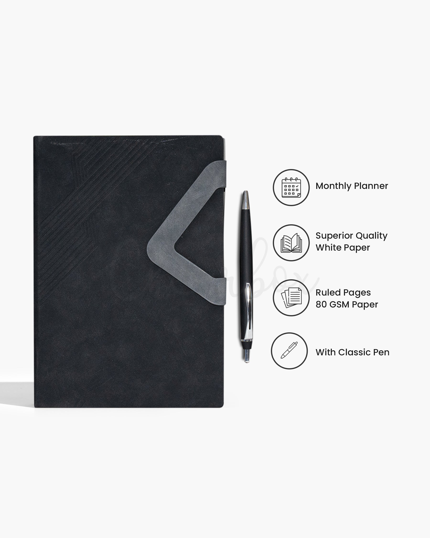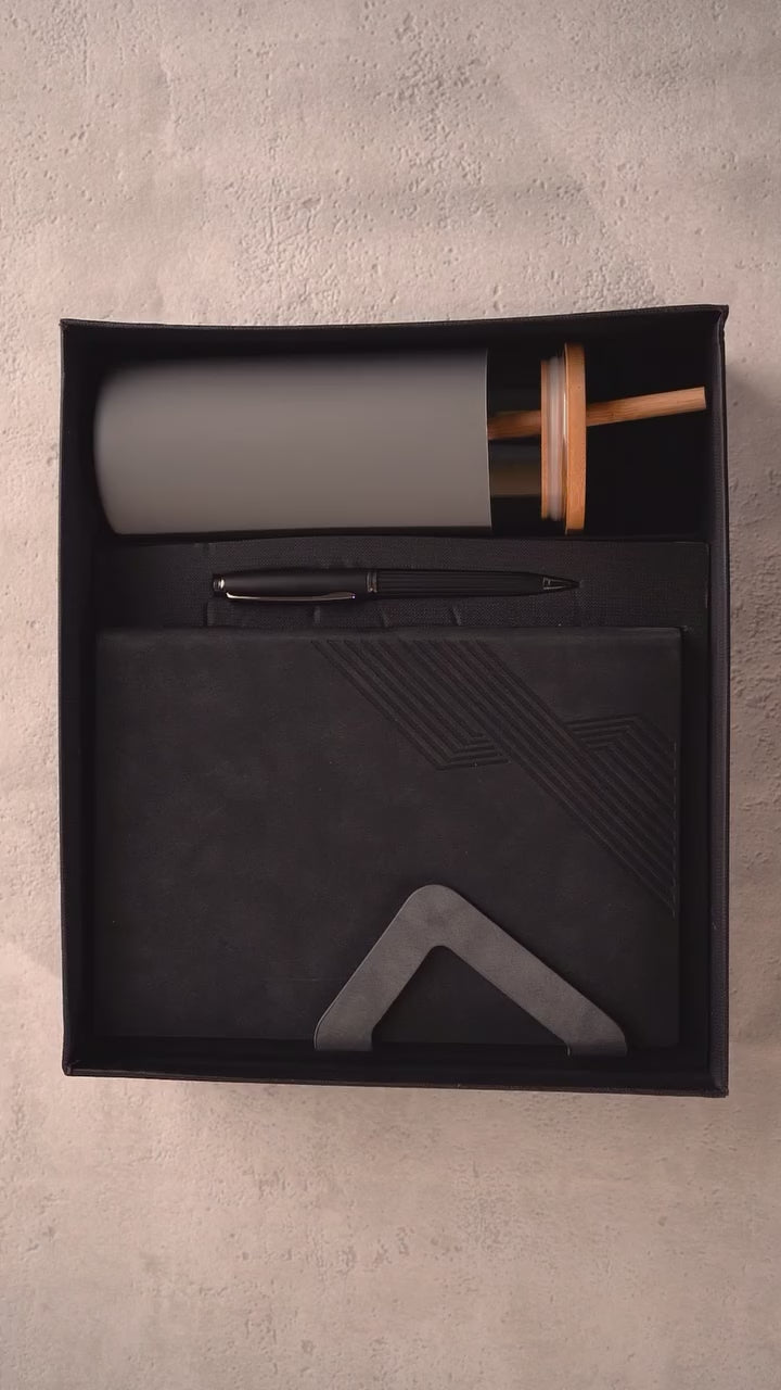 This all-in-one set includes a premium monthly planner, a sleek matte black executive pen, and an eco-friendly 480 ml Zentumbler making it perfect for professionals. The planner features a durable black textured cover with a gray accent strap and 80 GSM ruled white pages for a smooth writing experience. Its monthly layout helps you organize goals, track deadlines, and stay ahead of your schedule. The included pen is designed for comfort and balance, ideal for meetings or quick notes. The Zentumbler, made of borosilicate glass with a silicone sleeve, bamboo lid, and straw, is perfect for hot or cold drinks on the go. All items come neatly packed in a premium gray gift box which makes it ideal for corporate gifting or personal use.