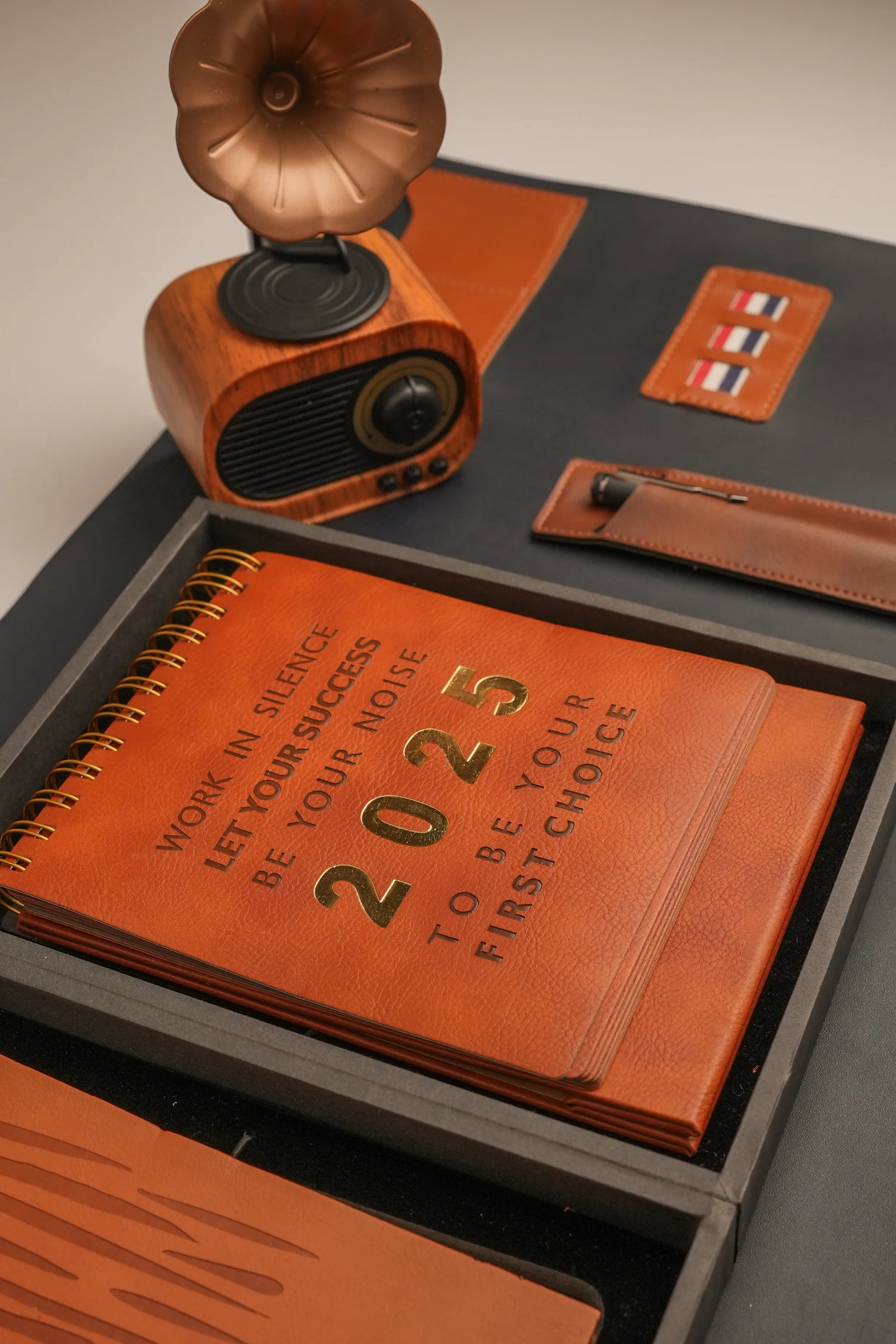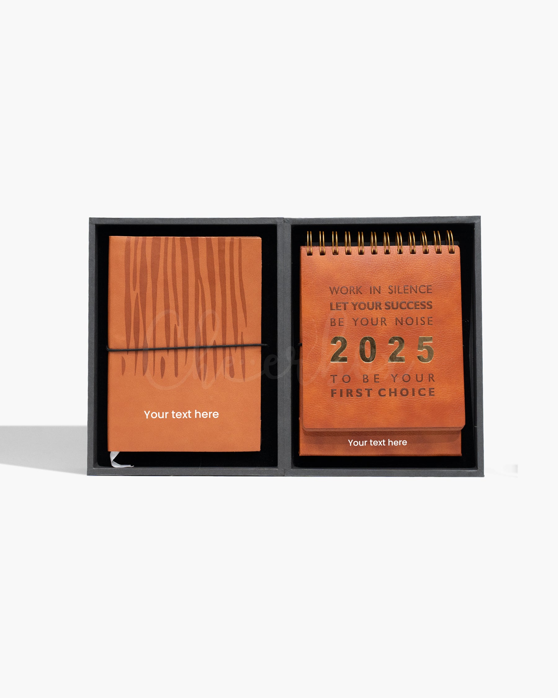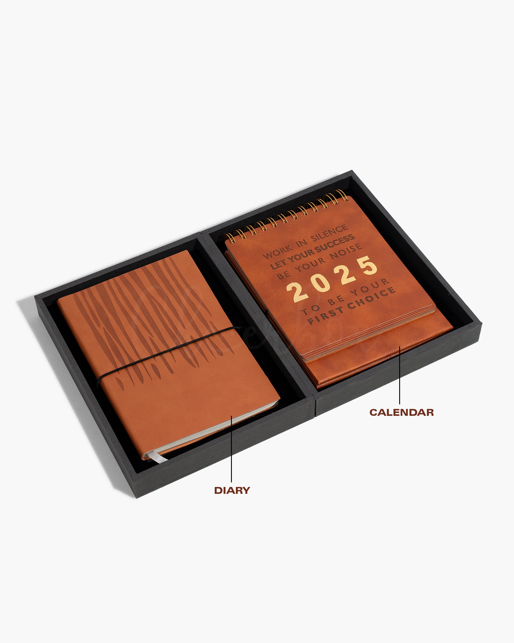 This elegant gift set includes a genuine leather-bound diary and a 2025 motivational calendar, both designed to inspire daily focus and long-term success. The diary is made from rich cognac-colored leather with natural grain patterns and gold lettering, offering a timeless and refined appearance. The spiral-bound calendar features the message “WORK IN SILENCE, LET YOUR SUCCESS BE YOUR NOISE,” along with the exclusive “2025” and “TO BE YOUR FIRST CHOICE” inscriptions. The entire set is housed in a sleek black gift box with beautiful detailing, making it perfect for executive use or prestigious gifting.
