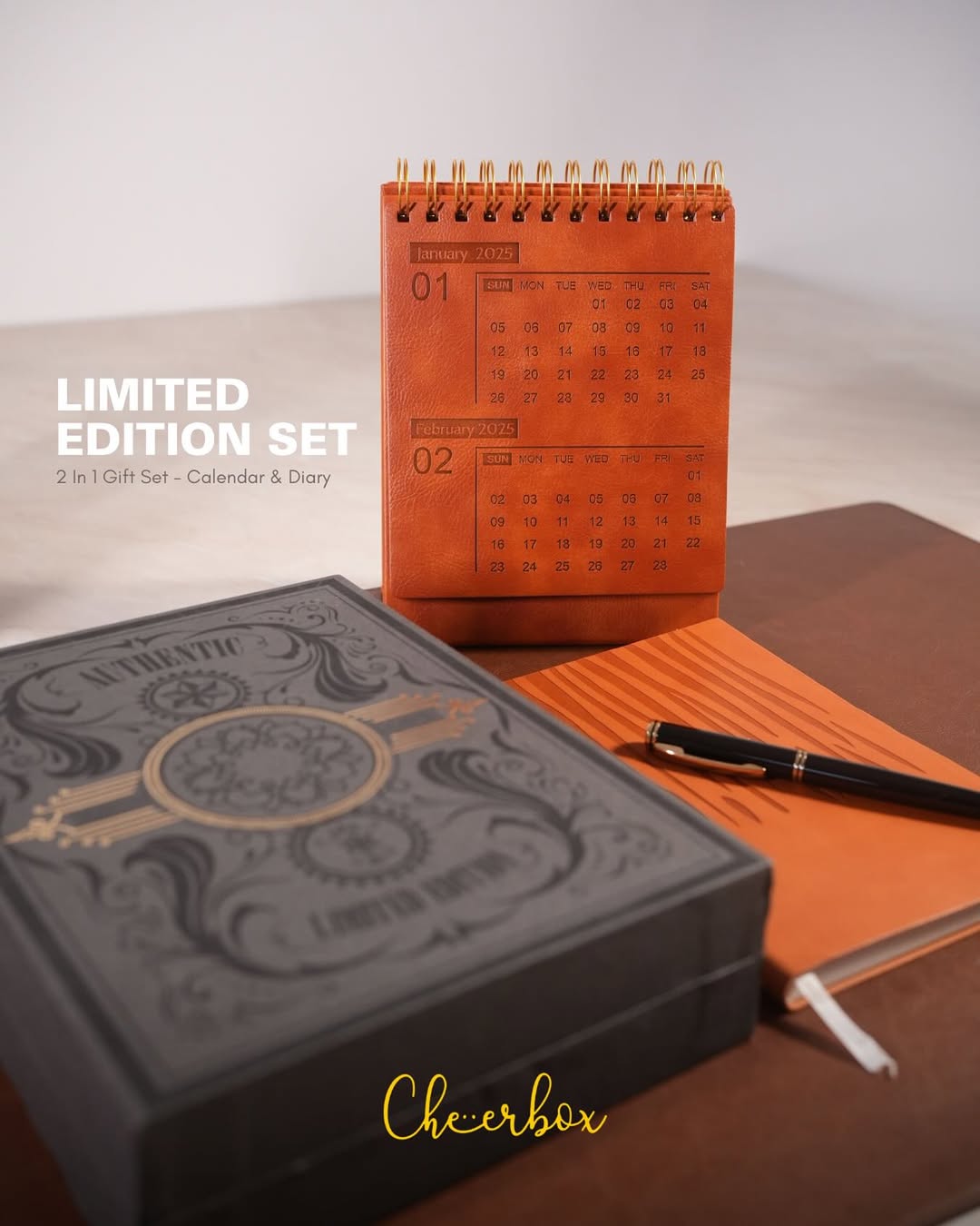 Material Used: Vegan cognac brown leather, 80 GSM writing paper, spiral-bound paper calendar, premium gift box.