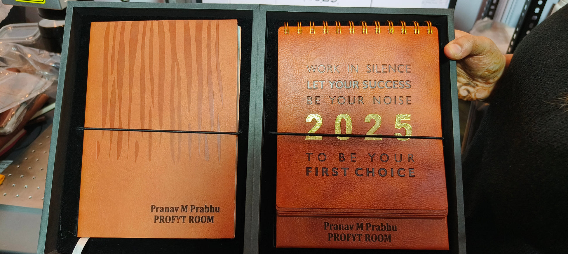 Specs: Leather-bound diary, 2025 motivational calendar with printed message, premium black and gold presentation box with compartments.