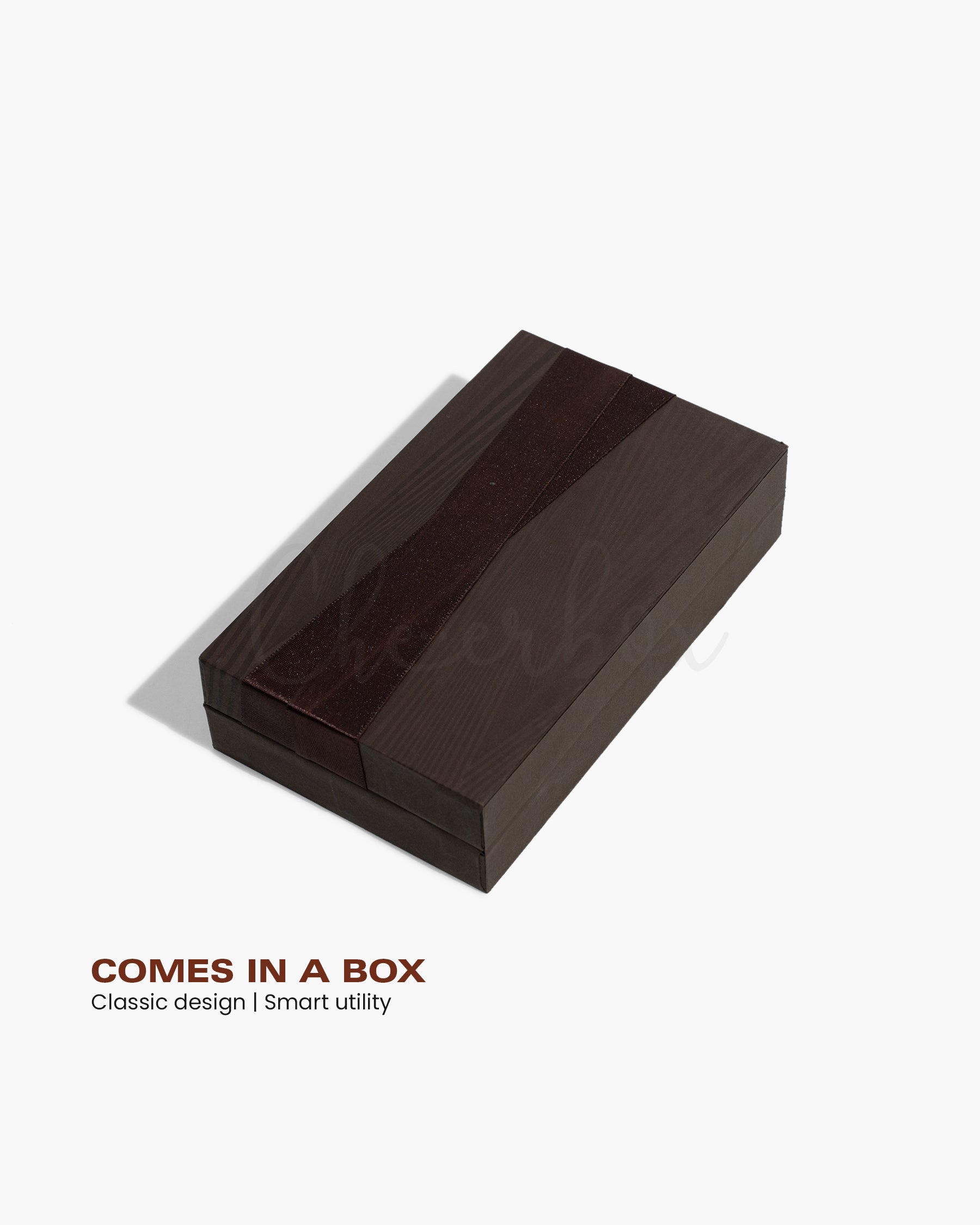 This sophisticated set includes a matte black ballpoint pen with gold accents and a matching keychain made from gold-tone metal and genuine black leather. The pen provides a balanced feel and smooth ink flow for comfortable writing. The keychain combines gold metal with a black leather strap, making it perfect for daily essentials. Packed in a wooden gift box with a plush velvet insert, this set is ideal for corporate gifting, milestones, or personal use.